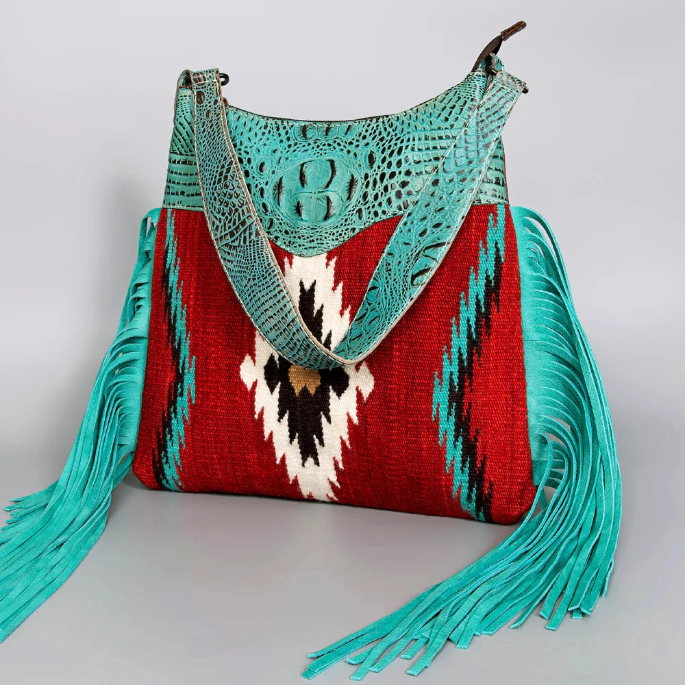 Looking for something different in a purse? Look no further! This turquoise & red Aztec pattern Saddle blanket purse with turquoise fringe has it going on!!Â