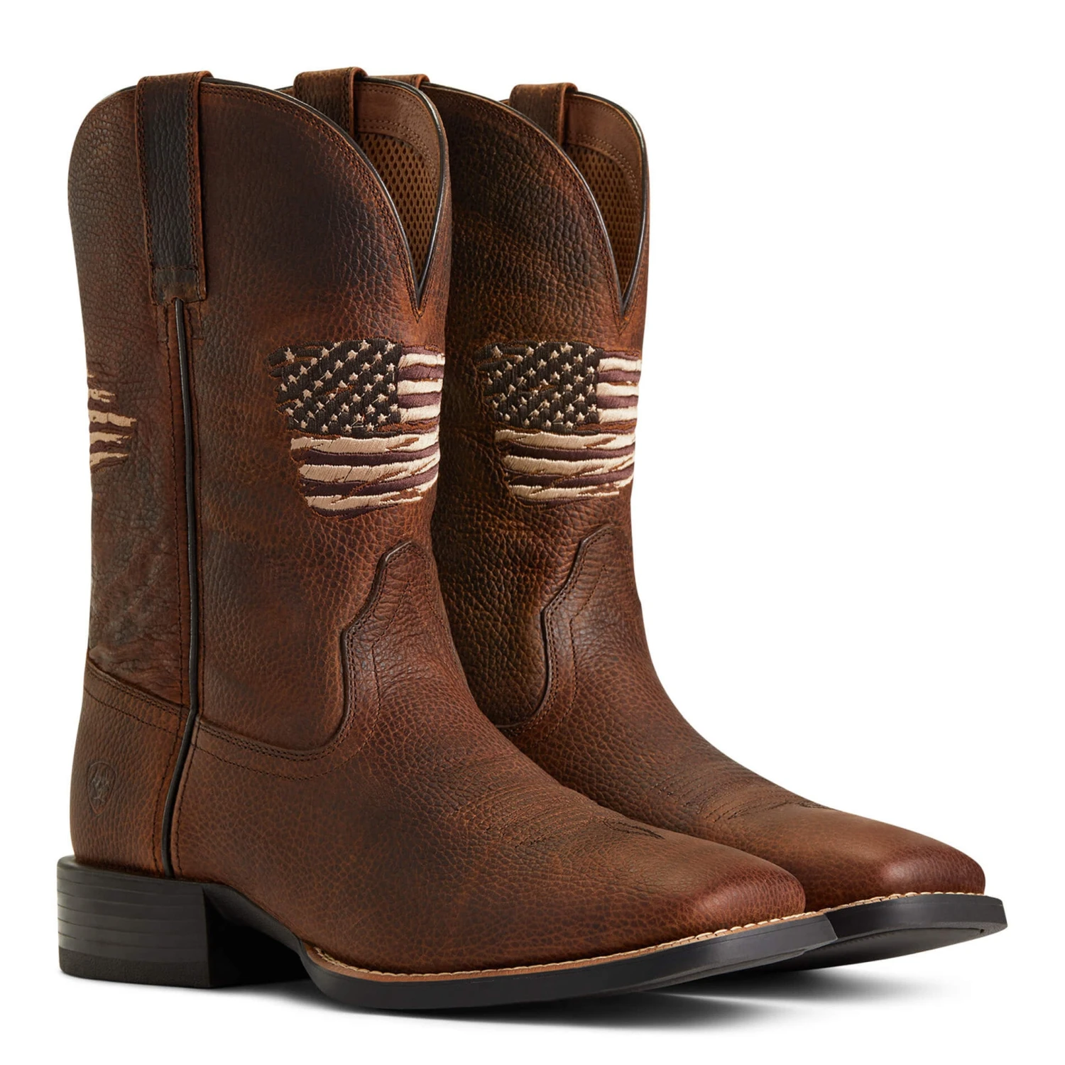 Ariat brings you a classic pair of patriotic square toe men’s boots. These boots feature a vintage stitched American Flag on the front. Great for everyday wear!