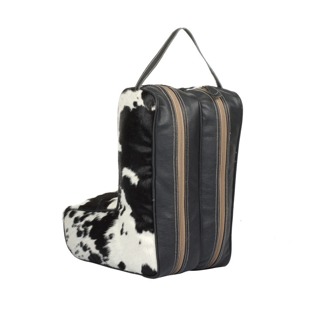 Boot bags are great for packing things in your luggage! Boot your boots in here so you don’t dirty fancy clothing! The black and white hide is authentic and perfect for every western gal!Â