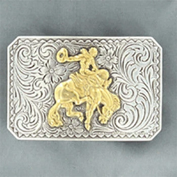 Nocona men’s western buckle features a silver floral engraved rectangle shaped buckle with a triangle edge and a gold bucking bronc motif in the center. Measures: 2″ X 3″