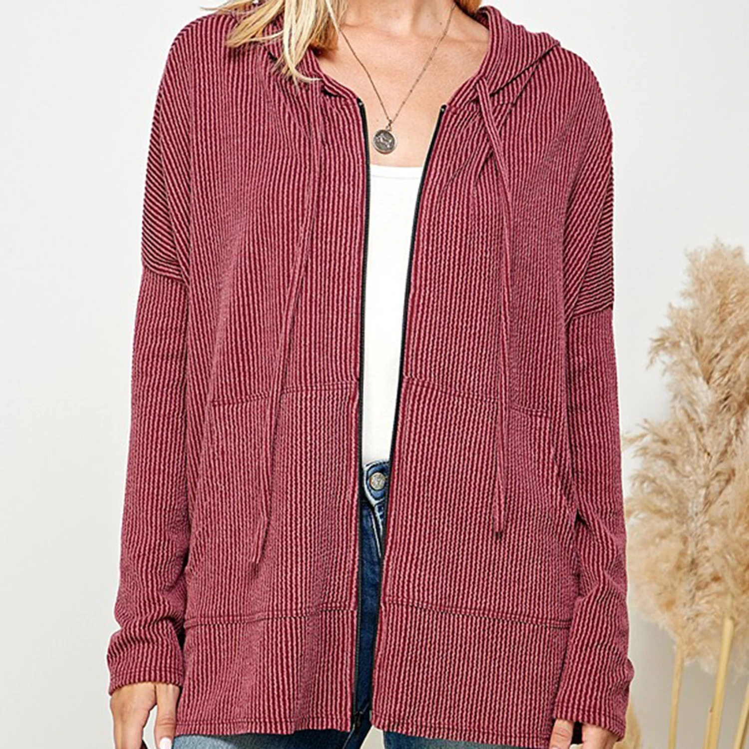Stay warm and comfy in this fun new burgundy zip up jacket!