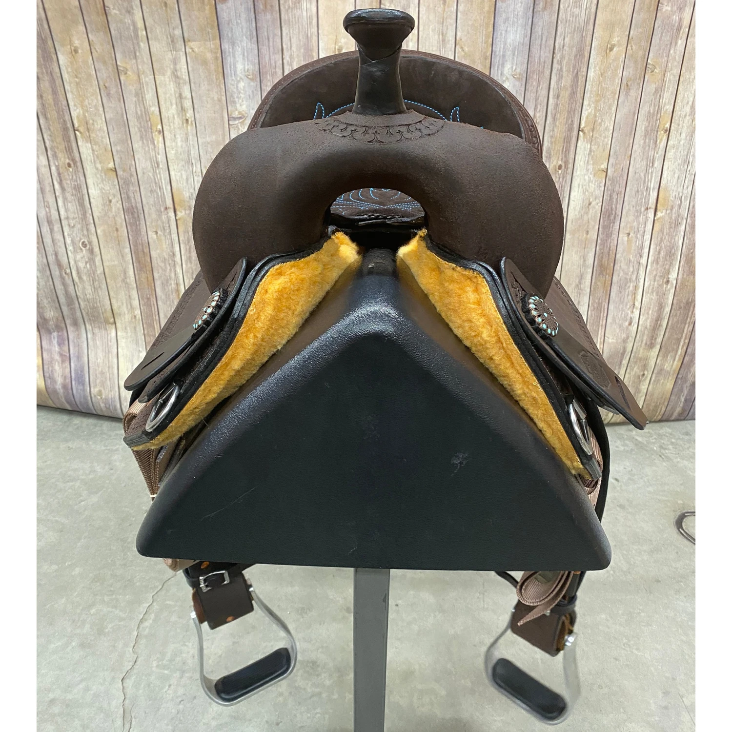 This Lindale Barrel Saddle was designed to win. When looking at this saddle it has a 5″ inch cantle and hiphugger roll in the suede seat which helps secure the rider in position during the tight turns. This saddle is a dark chocolate roughout saddle.Â