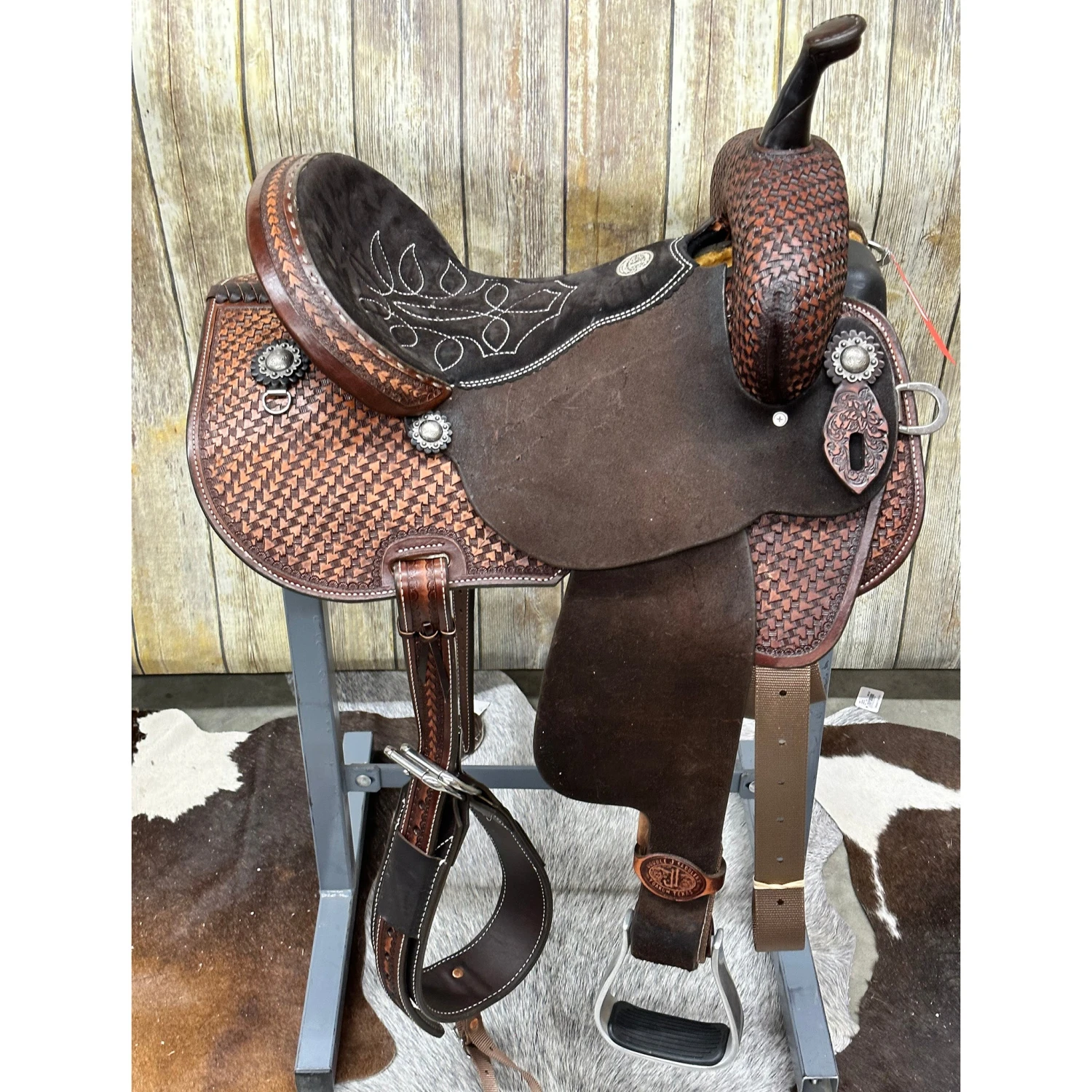 Calling all barrel racers! If you are looking for a new barrel saddle you do not want to miss this one. This beautiful two toned arrow barrel saddle was designed to win with the deep seat and the high saddle horn you will be ready to turn those barrels.Â