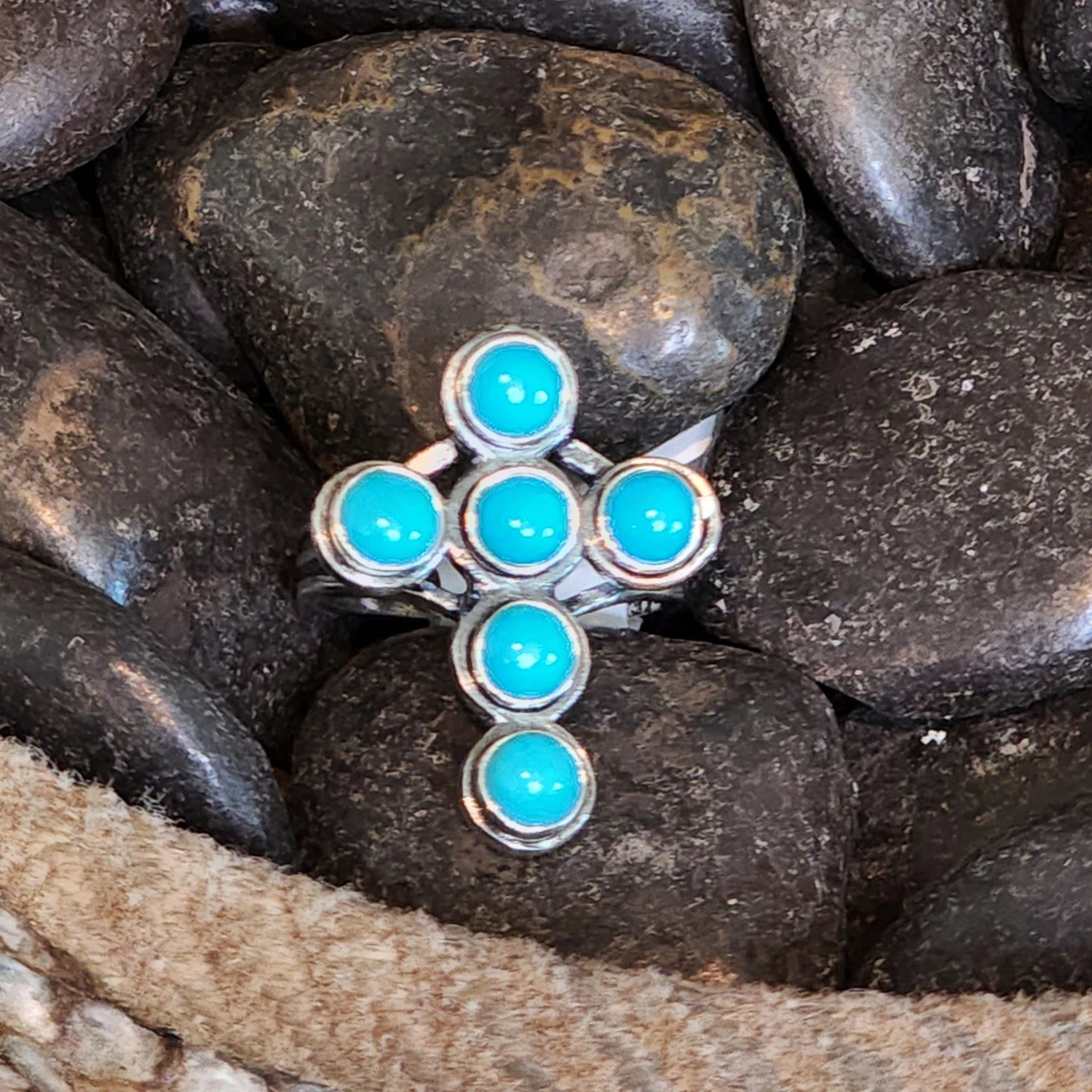 This is a cute 6 stone cross turquoise ring. Great character in this cute dainty ring.Â