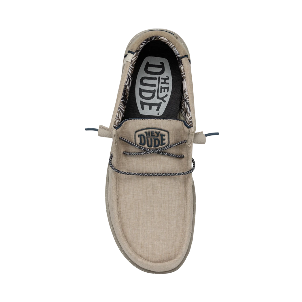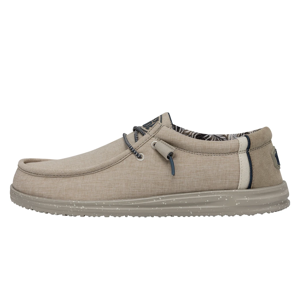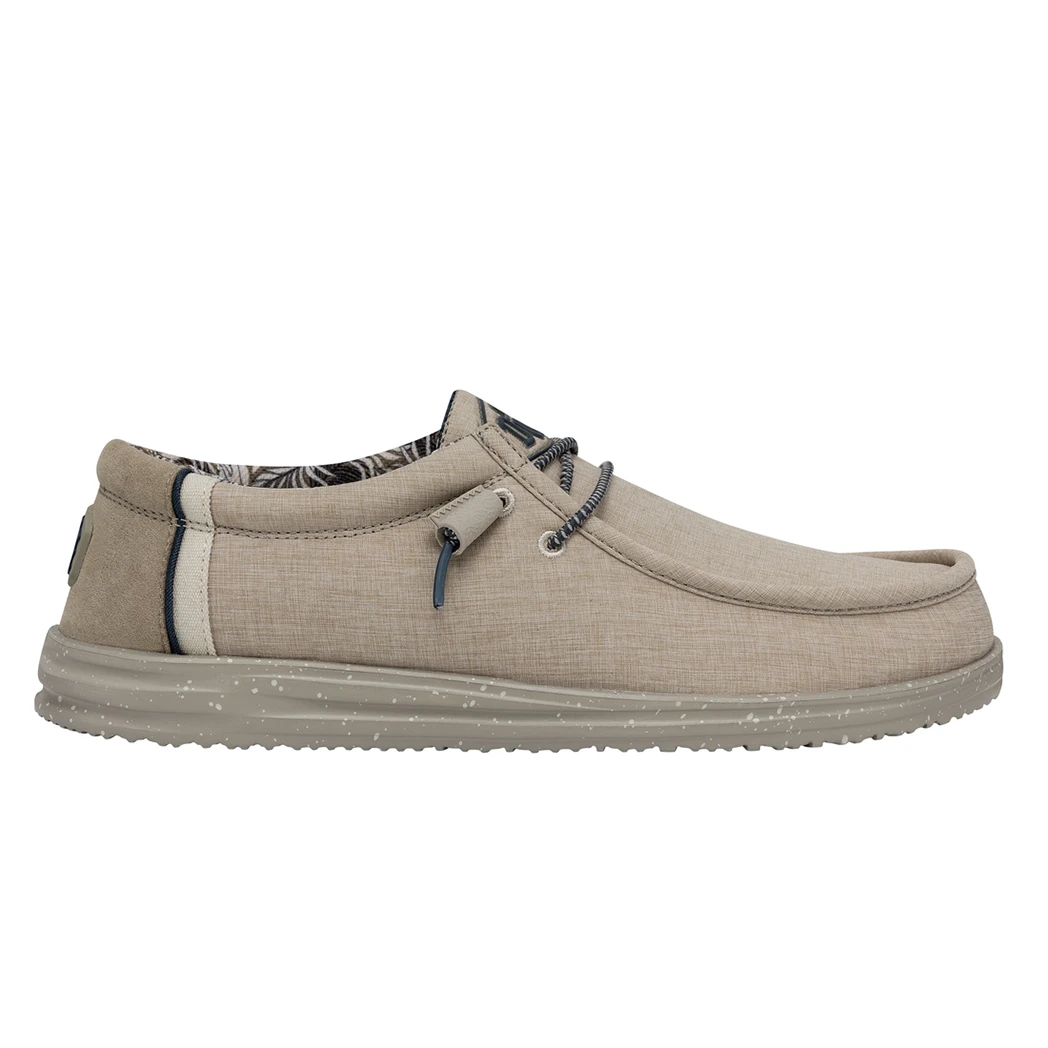 Perfect for the Lake or Beach, the Hey Dude Wally H20 Sand Dollar is a water-ready shoe, with a stretchy polyester upper and a soft cotton lining that keeps your feet cool and comfortable.  Elastic laces make the shoes easy to slip on and off and the perforated mesh insole adds an extra layer of cushion and air circulation to the tried-and-true foam outsole.Â