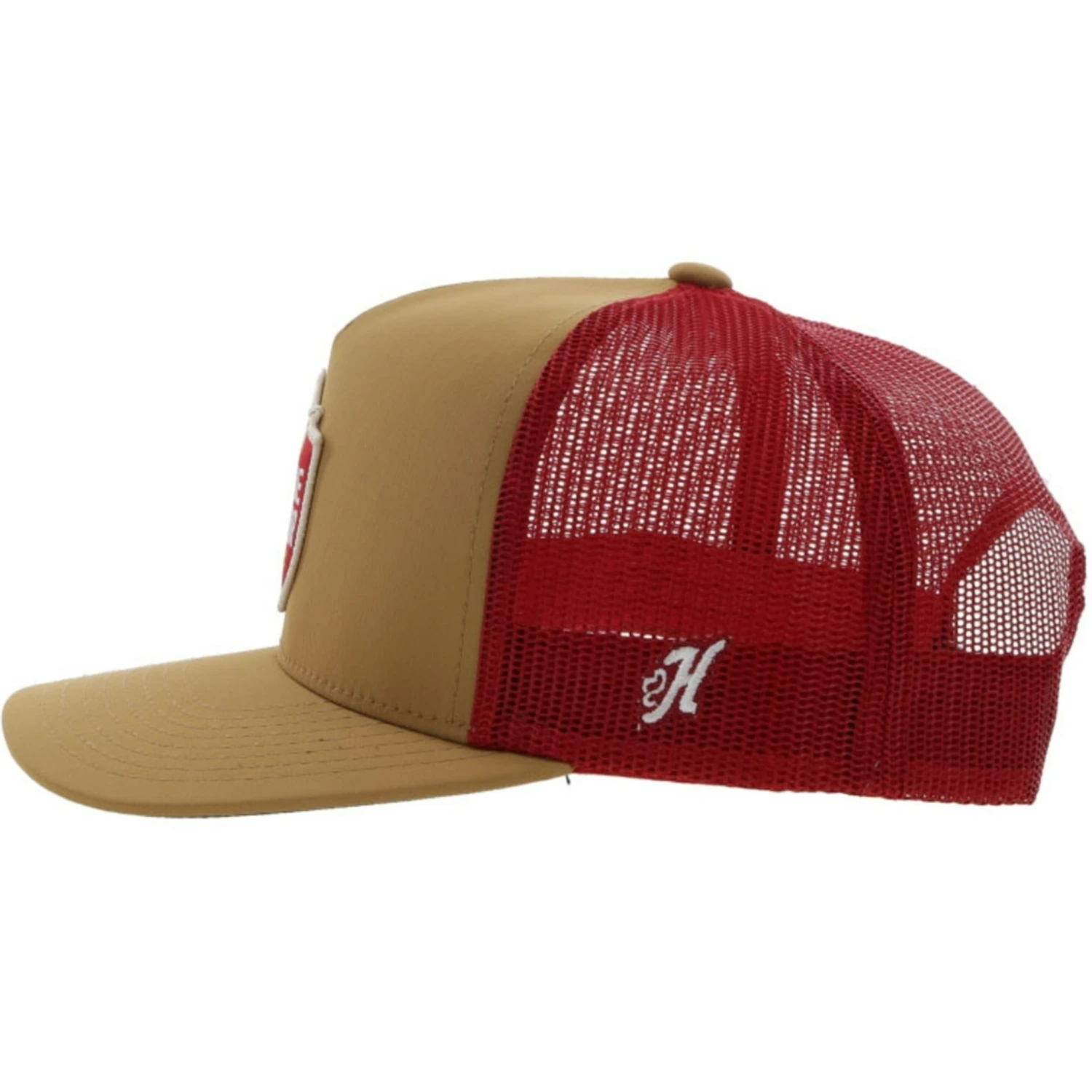 This work-tan and red high-profile 5-panel cap comes with a Hybrid bill and red mesh back. The front panels are made out of Odessa Fabric. This will help prevent sweat rings! Classic OSFA adjustable backstrap for fit. White accents on left side panel with Hooey H and also in the Lone Star patch add extra color.Â
