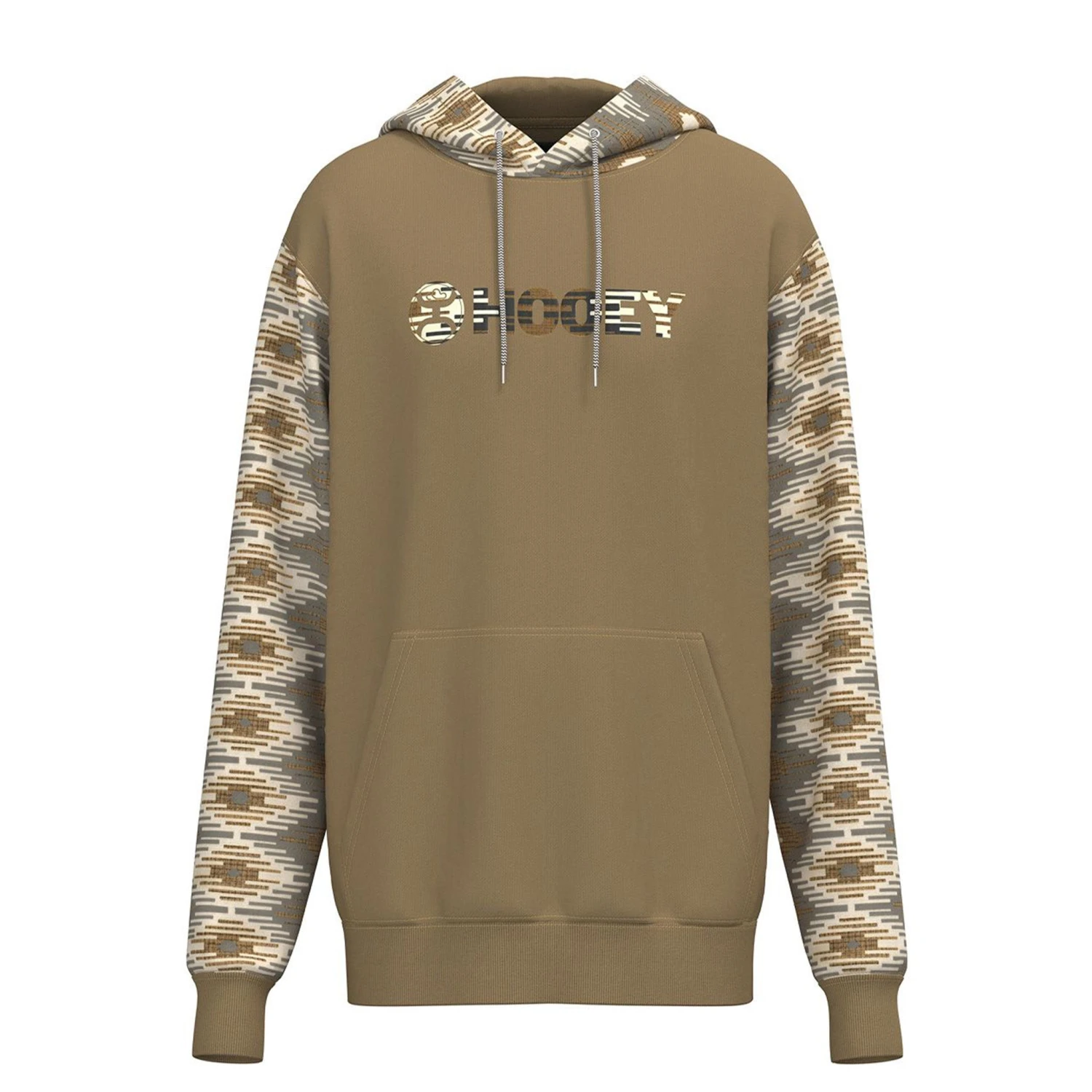 This tan with aztec sleeves hoodie has a Signature Soft Feel. The hood is double lined. Reinforced cuffs and waistband for wear along with a strengthened kangaroo pocket.Â