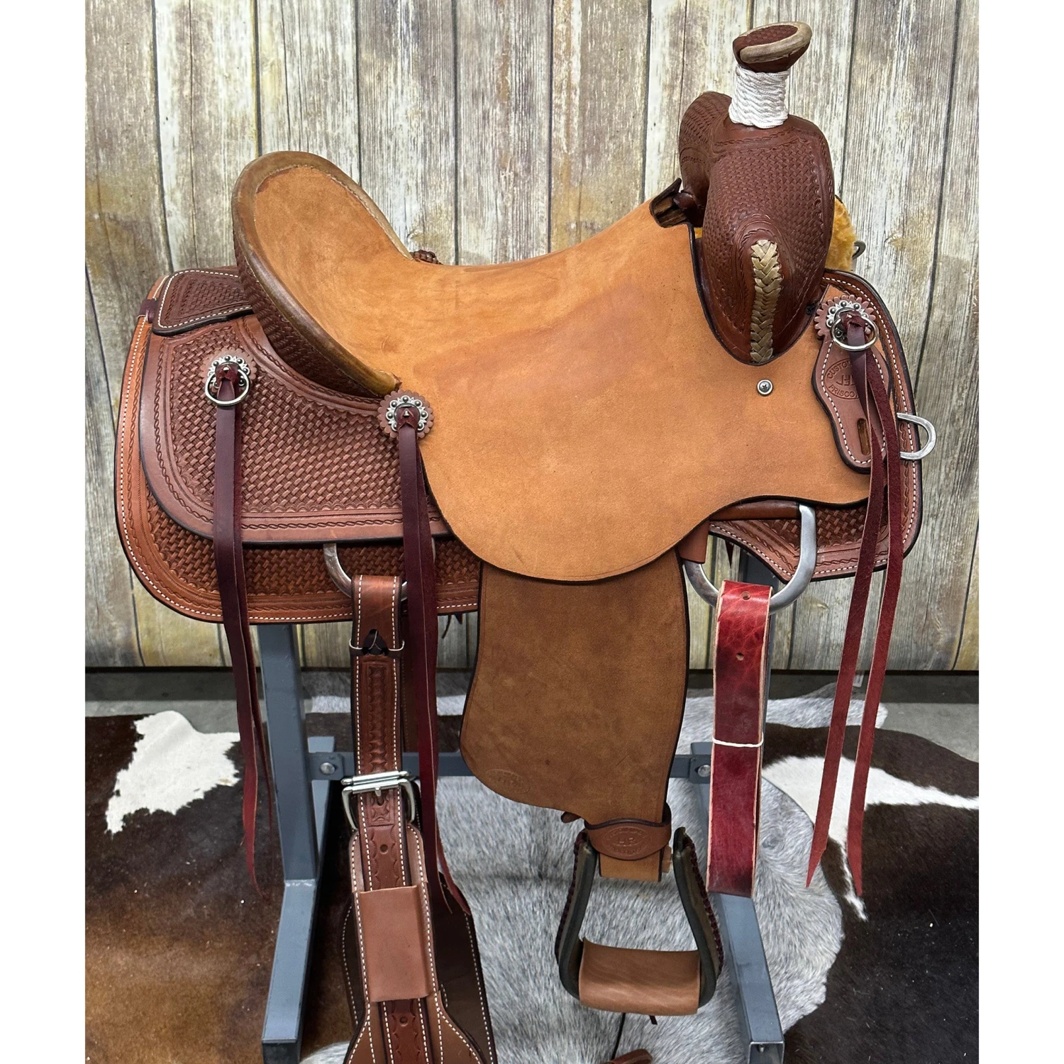 This Fitsbetter Saddle made by HR is not only great quality but great to look at. If you are spending hours in the arena or on a trail, then do not skip over this saddle as it would be a good one to add to your tack room. Many tack sets will match the basket weave tooling.Â