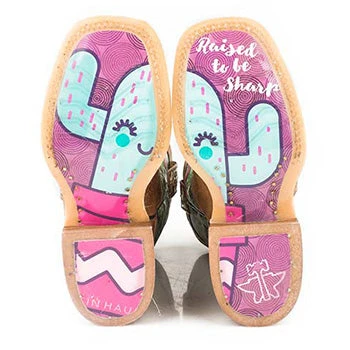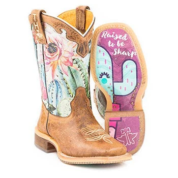 Your little cowgirls will look so cute running around wearing these boots. They feature a brown leather foot with an embroidered shaft with a cactus and flower design.