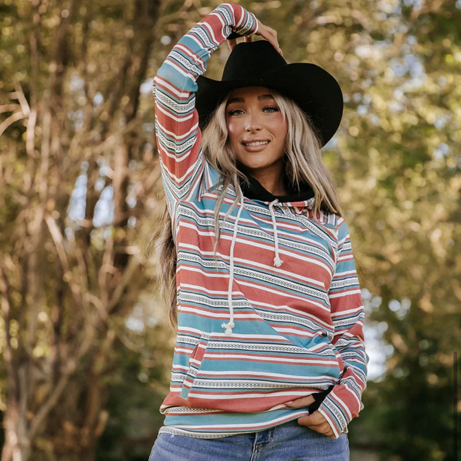 This “Lips are Sealed” double hood hoodie is a fan favorite with the triple stretch and multi-colored striped patterned throughout. It features raglan sleeves, thumbholes, and has side pockets.Â