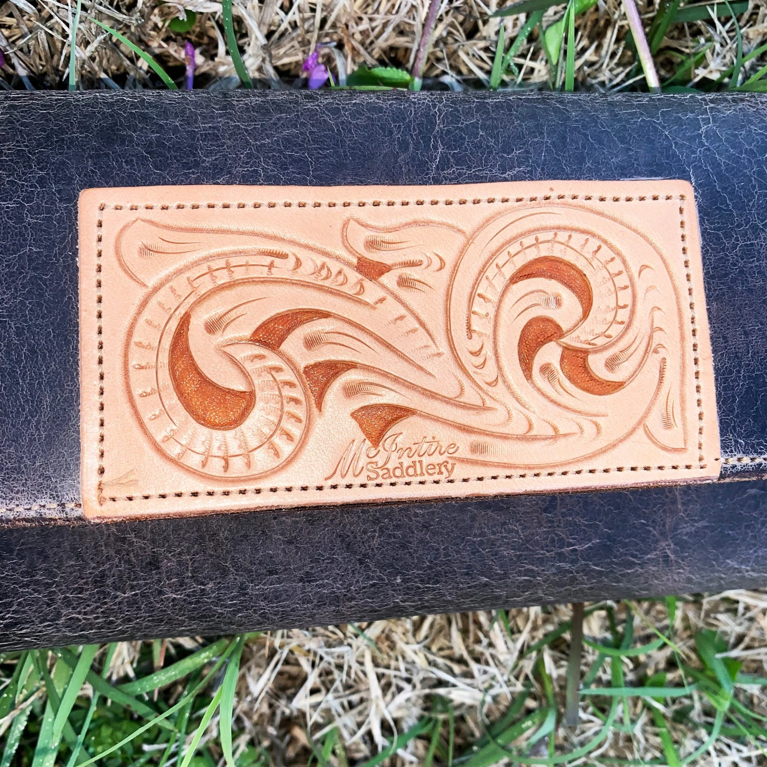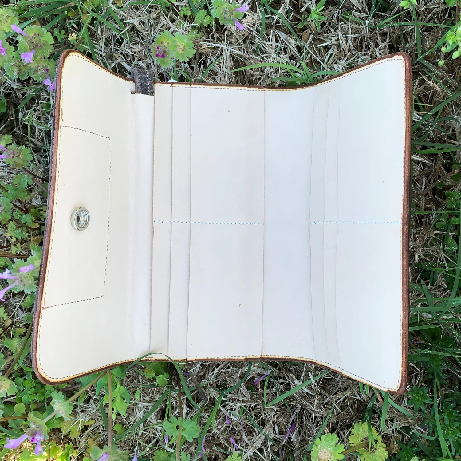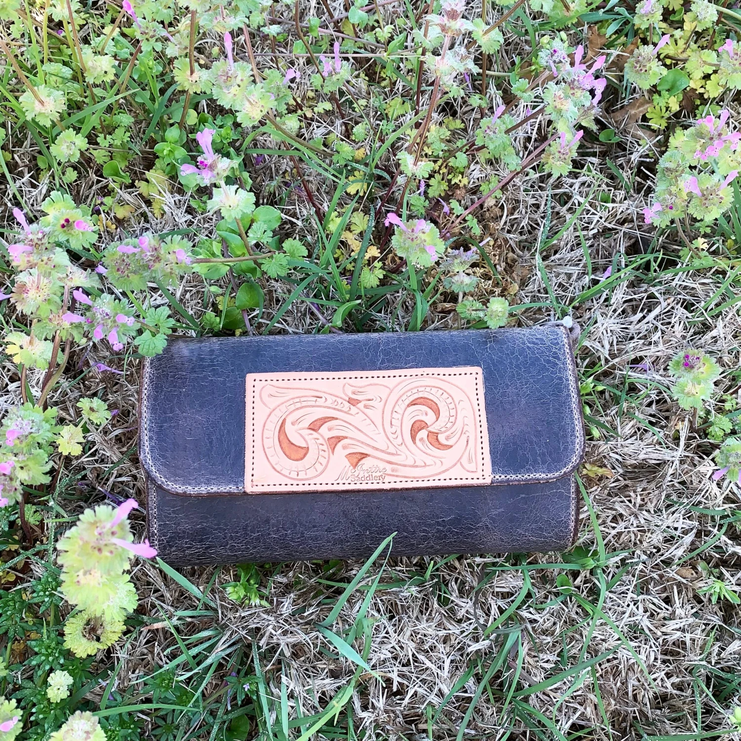 The crackled effect on this wallet makes it looked distressed. The leather patch really stands out against the dark colored wallet. We love this wallet and know you will too.Â
