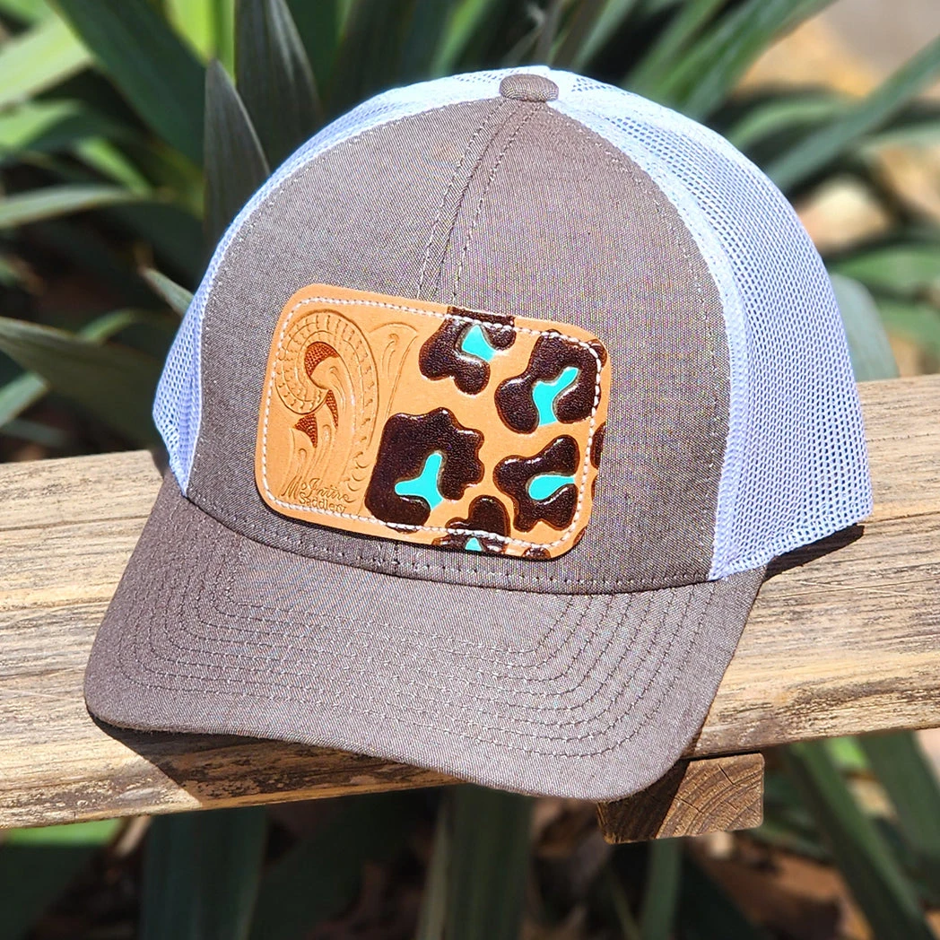 McIntire Saddlery Tan Cap with  Brown & Turquoise Leopard Leather Patch.Â