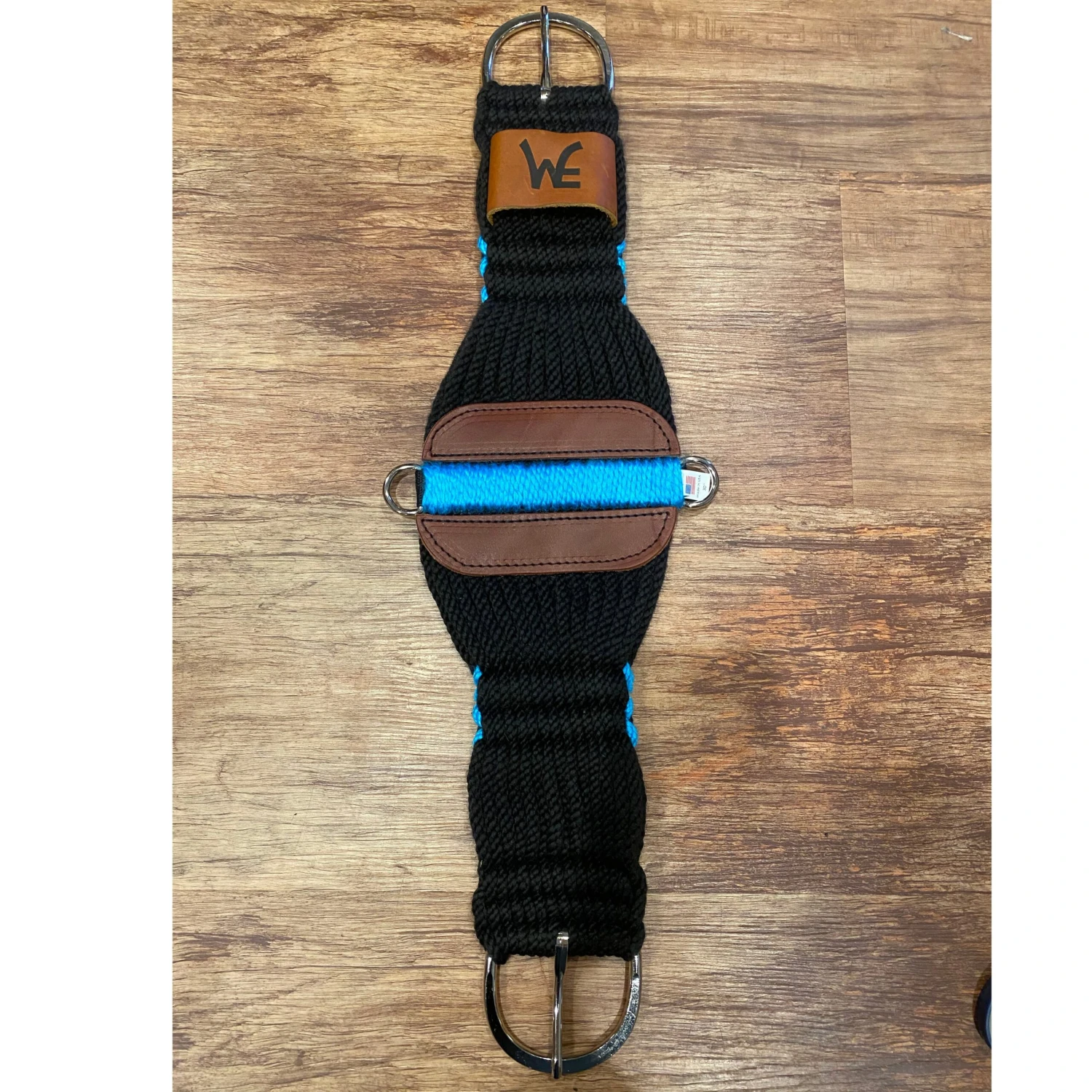 This Black and Blue Rayon Roper Cinch from Mustang, features 27 Strands of Rayon and A blue wrapped center, with leather sewn sides, and N.P Hardware.