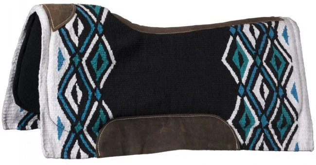This large 36” x 34” size fits most show saddles. It is a beautiful teal, black,and white color. Heavy 5 lb New Zealand wool saddle pad features hand woven designs with a 1” felt bottom and wear leathers.