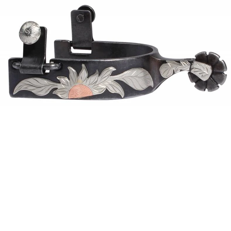 These beautiful Professional’s Choice handcrafted spurs with sunflower design on the 1″ band, with a blunt 8 point rowel are flashy and classic all at the same time.Â