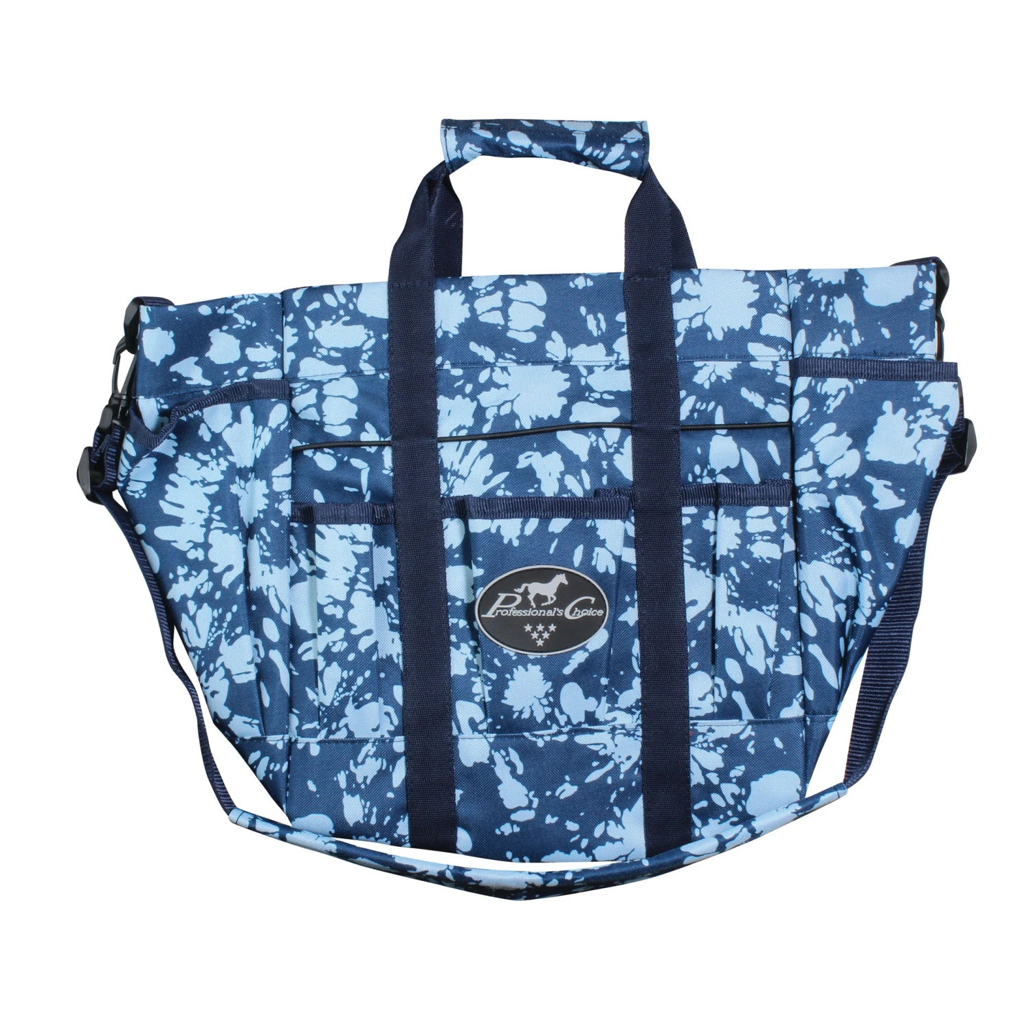 Multiple pockets for numerous functions. From the job site to the barn, yard or garden, this bag can carry it all. Six smaller pockets hold tools, gardening utensils, brushes and other grooming equipment. The nylon elastic bands hold taller items upright. Two tall side pockets hold items secure with hook and loop closure. The inside features two large pockets and an open center. Two handles and a padded adjustable/removable shoulder strap for convenient carrying.