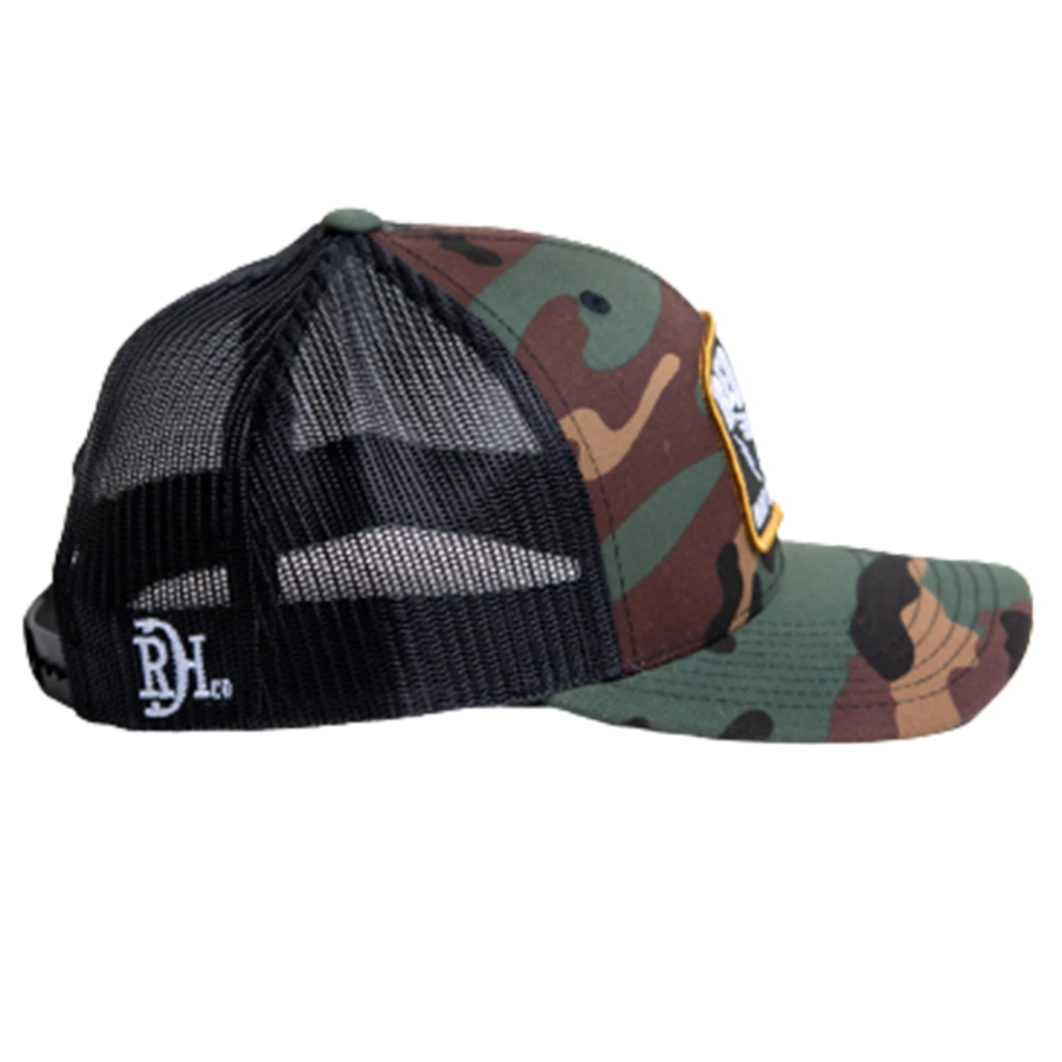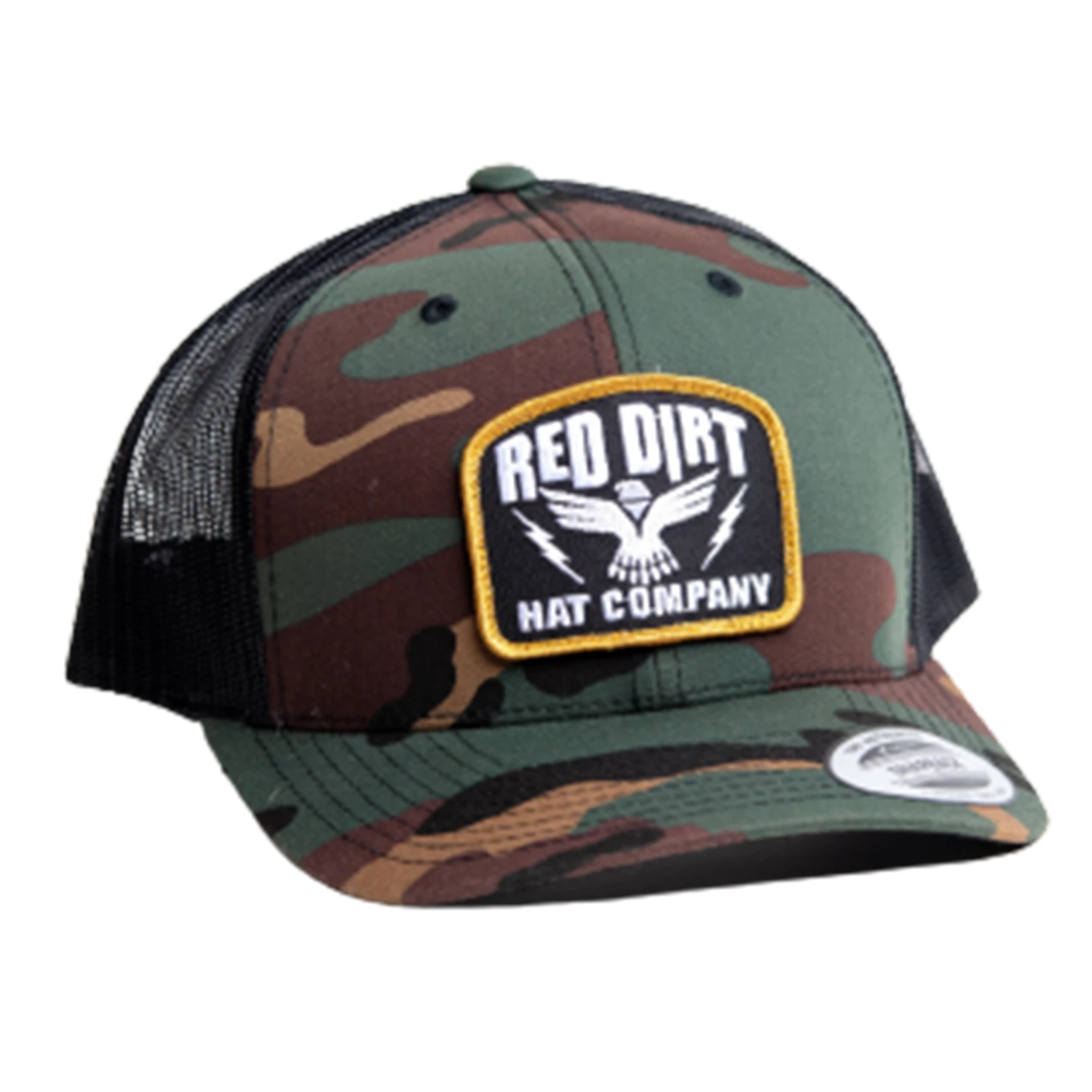 This Red Dirt Camo & Black 6 panel style snapback cap features the “Thunderstruck” patch.
