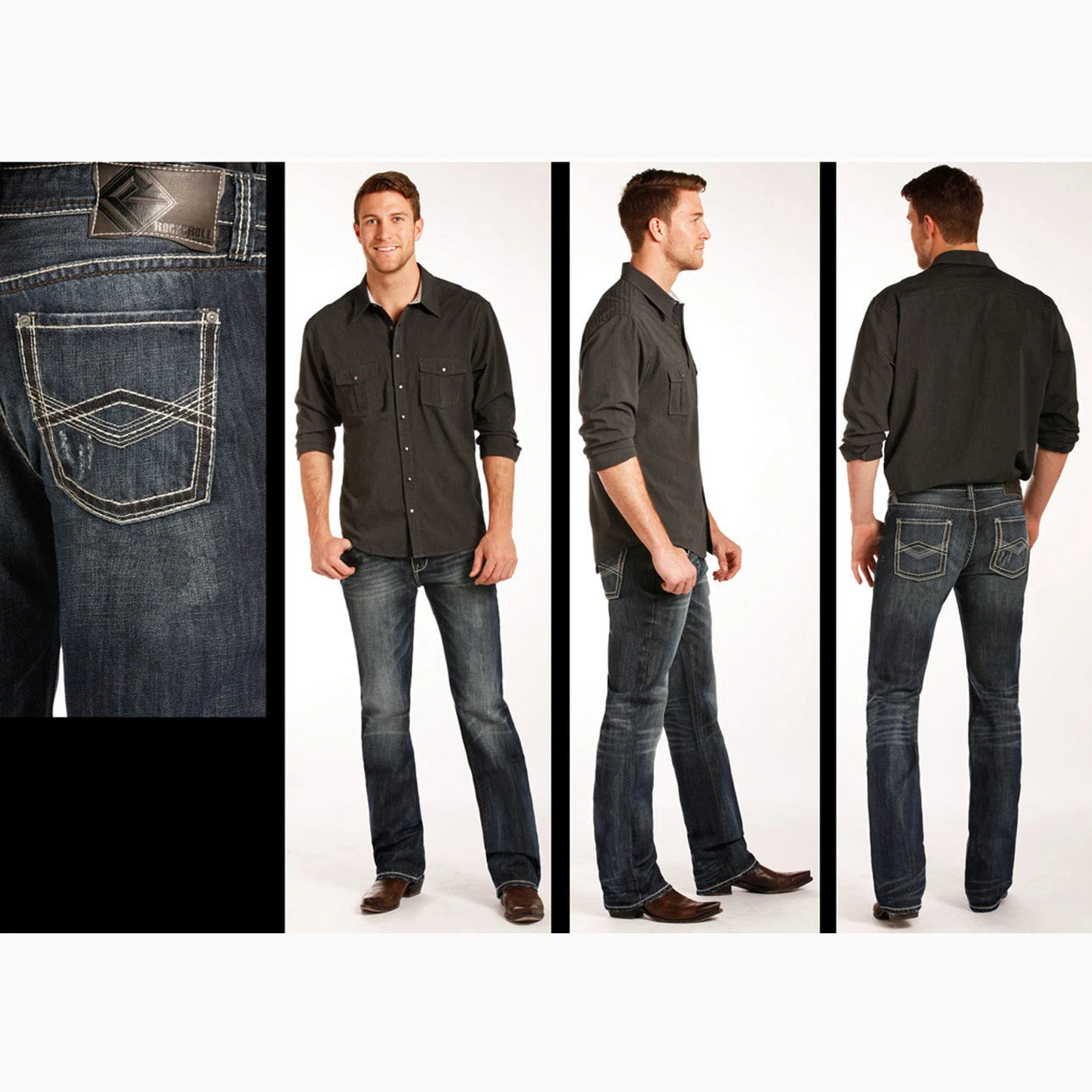 Rock & Roll Denim Men’s pistol straight leg in dark wash with zig zag stitch details on back pockets.Â