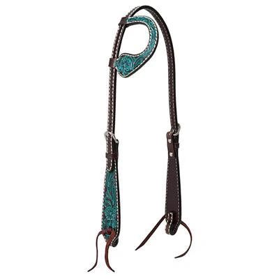 This sliding one ear headstall from Weaver Leather is a dark oil! It has a carved floral design highlighted with a turquoise stain!Â