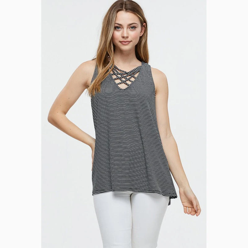 This women’s tank features a black and white stripe design throughout! The criss cross neckline adds the perfect amount of detail!Â
