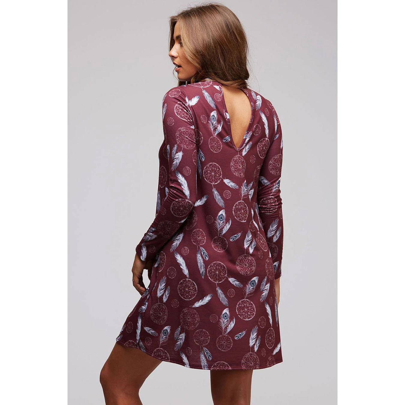 Wear your cowgirl dreams on your sleeve – and everywhere else for that matter! Dream catchers in shades of grey dot the burgundy bodice of this uniquely styled dress. You’ll be keeping the dream alive, both coming and going, with a stunning neckline that features a criss-cross choker in the front and a teardrop cutout in the back.Â