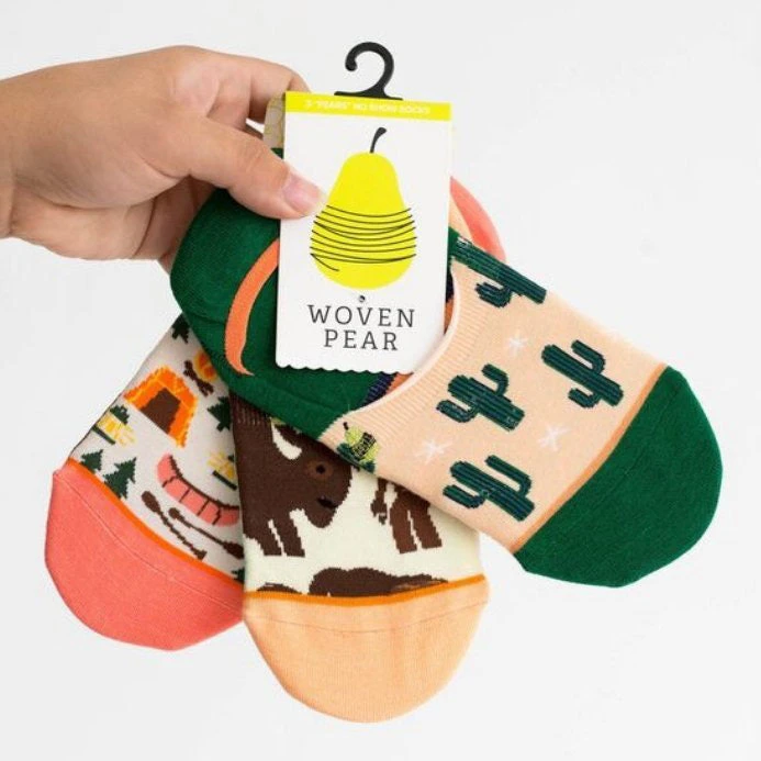 These women’s no show socks are perfect for flats and mocs! They feature fun outdoor themes including cacti, buffalo, and camping items!Â